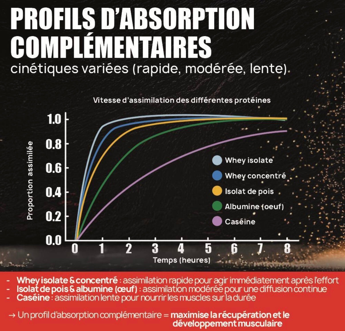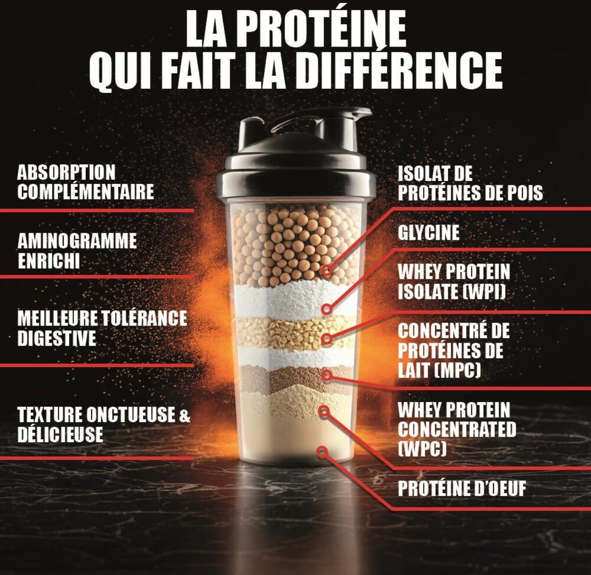 - Concentré de protéines de lait (MPC) : digestion plus lente, apport prolongé en acides aminés