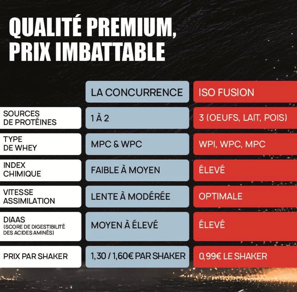 Résultat : l'ISO FUSION dispose d'un profil complet, parfaitement assimilable, idéal pour stimuler la synthèse protéique et réduire le catabolisme musculaire, tout en évitant les inconforts digestifs.